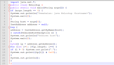 listing getIP.java terdapat library java.net.* dengan nama class yaitu getIP. Setelah